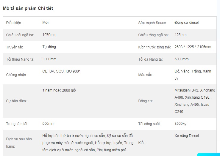 Bảng Thông số kỷ thuật xe nâng VMAX 3,5 tấn Trung Quốc.